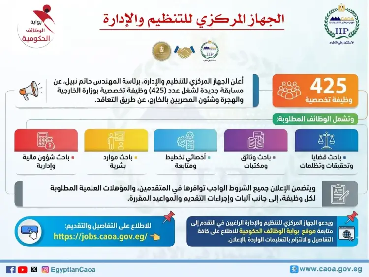 أعلن الجهاز المركزي للتنظيم والإدارة اليوم الإثنين الموافق 15 ديسمبر 2025، عن فتح باب التقديم لشغل 425 وظيفة تخصصية بنظام التعاقد في وزارة الخارجية والهجرة وشؤون المصريين بالخارج.