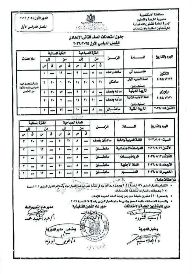 جدول امتحانات الصف الثاني الإعدادي محافظة الإسكندرية الترم الأول 2026