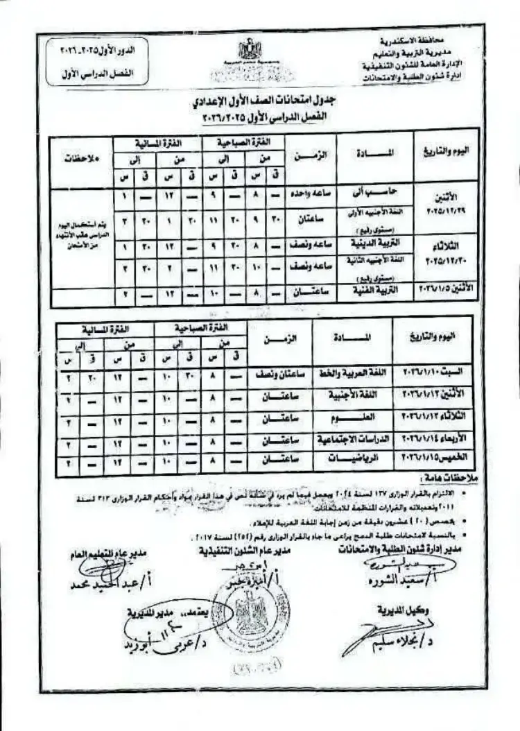 جدول امتحانات أولى إعدادي ترم أول 2026 الإسكندرية