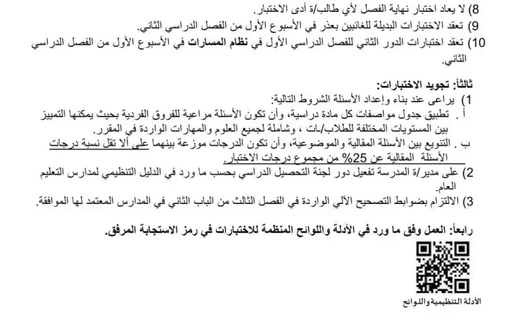 وشددت الإدارة على أن تصحيح هذه الاختبارات سيتم وفق آلية التصحيح المعتمدة في المدرسة، مع منع استخدام التصحيح الآلي للصفوف والمواد المشمولة بقرار المركزية.