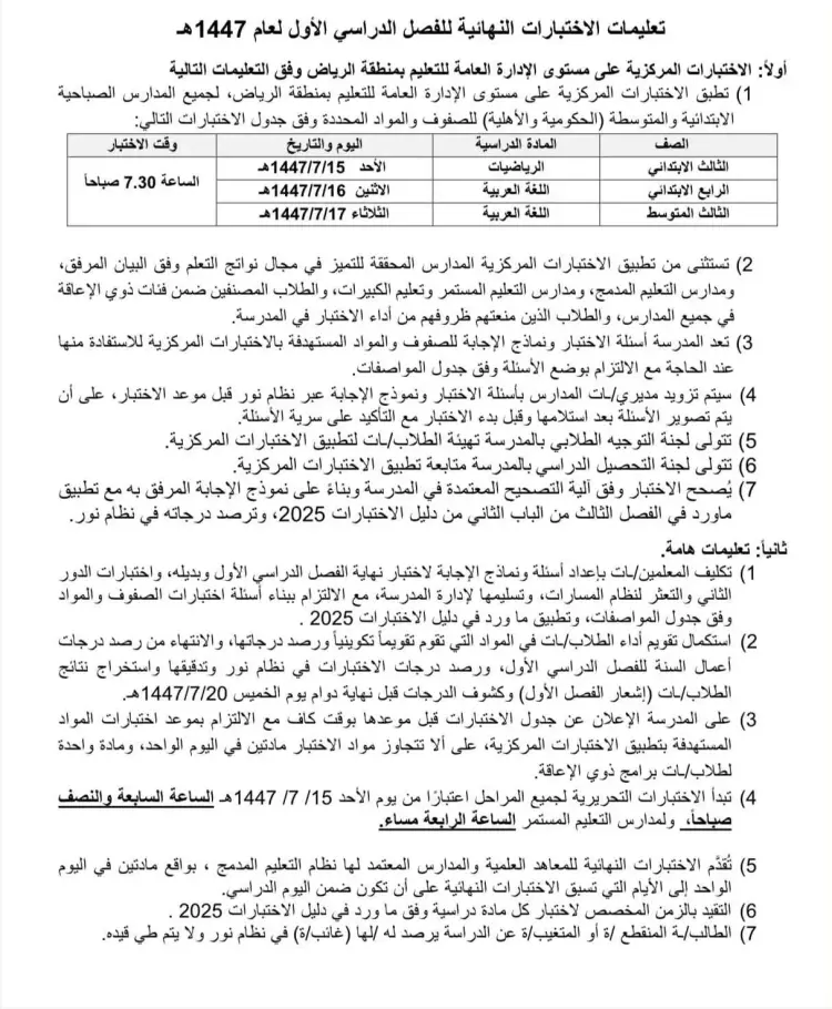 جدول الاختبارات المركزية في الرياض 1447 رسميا