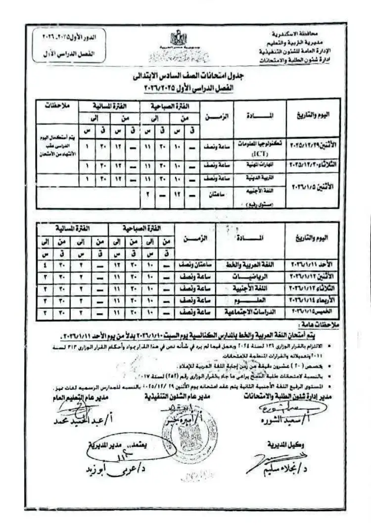 جدول امتحانات الصف السادس الابتدائي محافظة الإسكندرية الترم الأول 2026