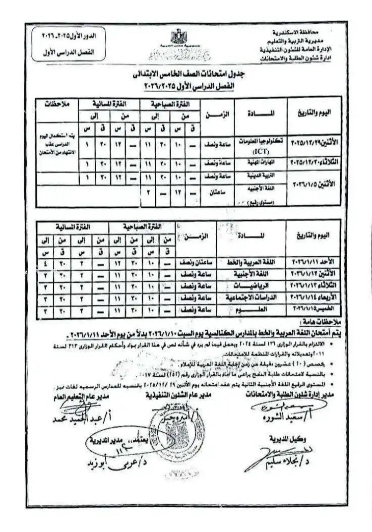 جدول امتحانات الصف الخامس الابتدائي محافظة الإسكندرية الترم الأول 2026