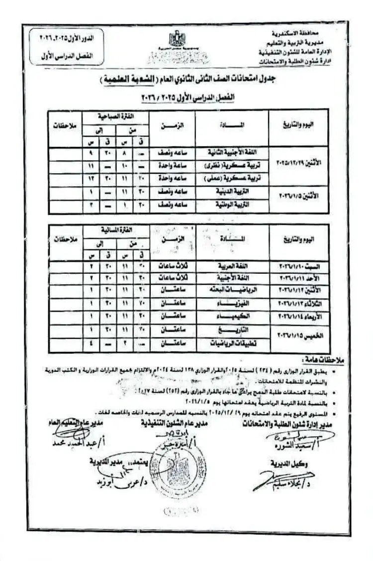 جدول امتحانات الصف الثاني الثانوي محافظة الإسكندرية الترم الأول 2026 أدبي وعلمي