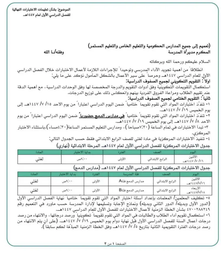 • تجري مدارس الدمج (فئة B) اختبار مادة لغتي لطلاب الصف الرابع الابتدائي يوم الأربعاء 18 رجب 1447.
