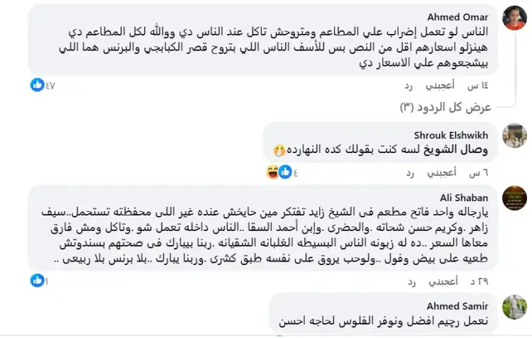 طالب بعض المستخدمين بضرورة عمل إضراب عن المطاعم التي ترفع أسعارها بشكل جنوني، مؤكدين أن امتناع الجمهور عن الشراء هو الوسيلة الوحيدة لإجبار هذه المنشآت على خفض التكاليف.