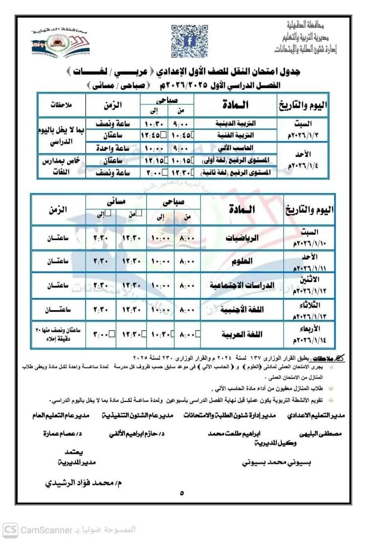 جدول امتحانات الصف الأول الإعدادي محافظة الدقهلية الترم الأول 2026