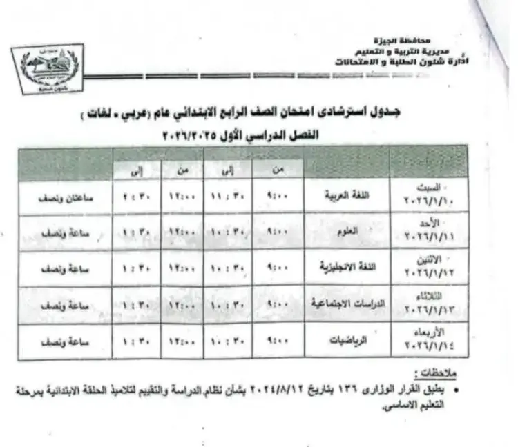 جدول امتحانات رابعة ابتدائي الترم الأول 2026 الجيزة