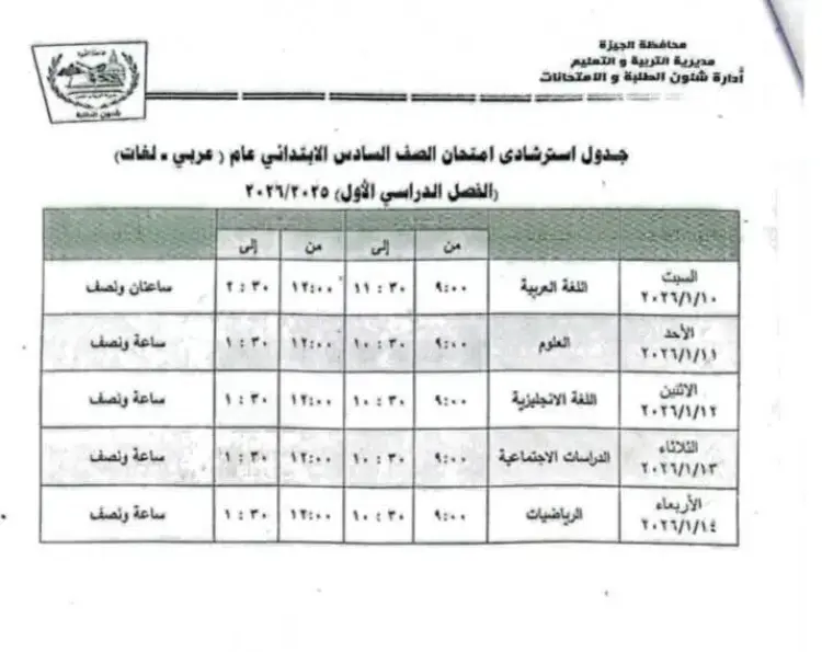 جدول امتحانات الصف السادس الابتدائي الترم الأول 2026 الجيزة