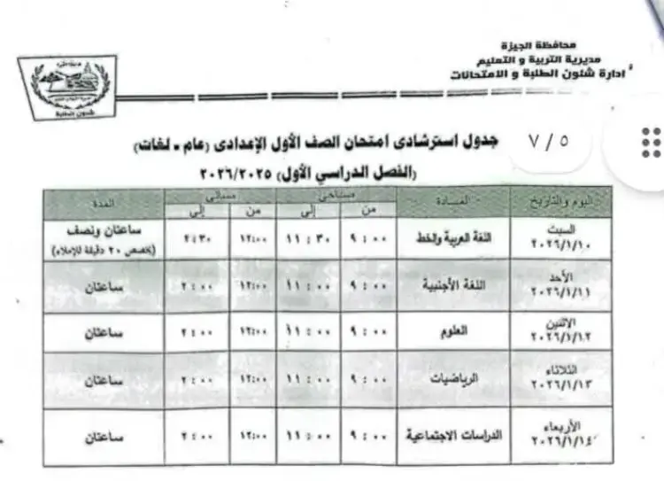 جدول امتحانات أولى إعدادي محافظة الجيزة الترم الأول 2026