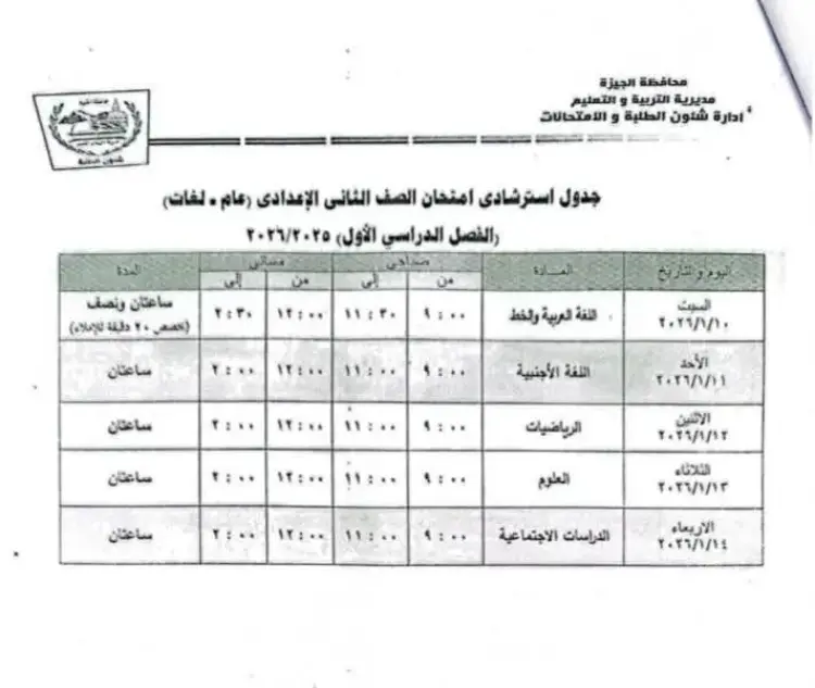 نتطرق في السطور التالية إلى جدول امتحانات الترم الأول الصف الثاني الإعدادي 2026 الجيزة.