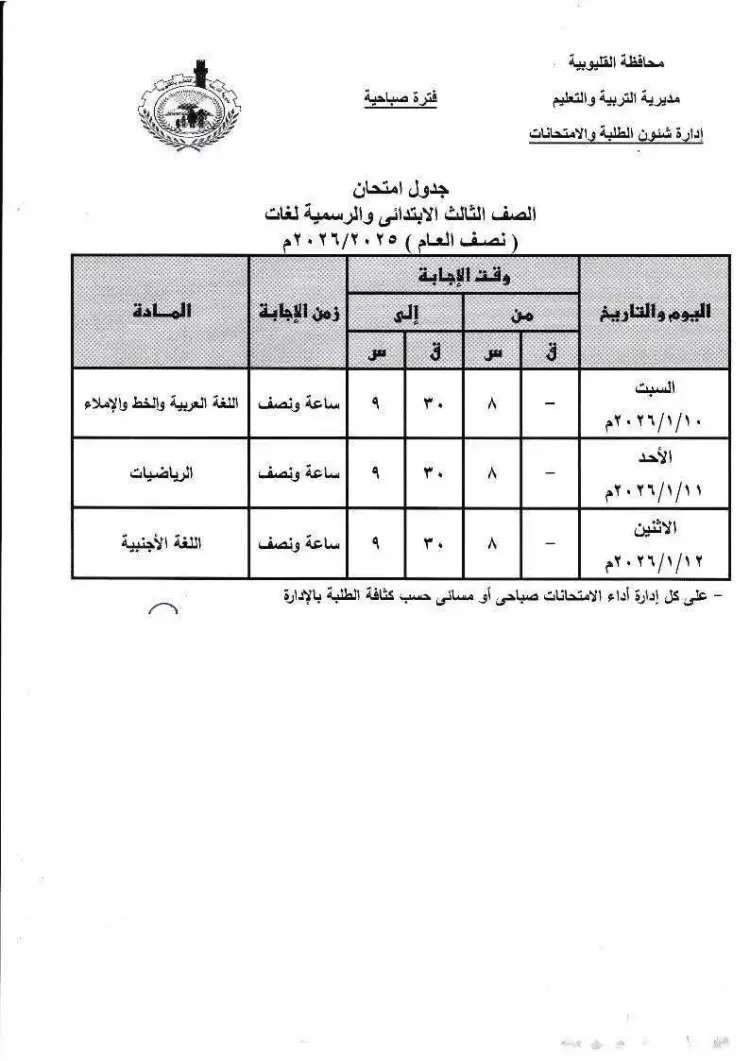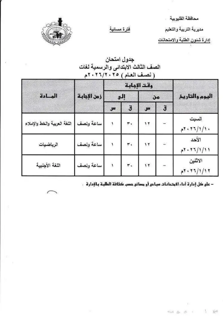 جاء جدول امتحانات الترم الأول الصف الثالث الابتدائي 2026 القليوبية على النحو التالي: