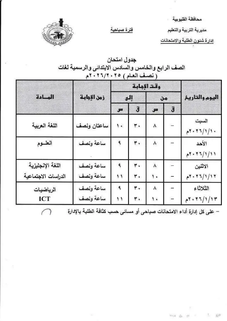 جدول امتحانات الترم الأول الصف الخامس الابتدائي 2026 القليوبية