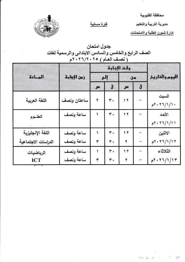 نتطرق في السطور التالية إلى جدول امتحانات الترم الأول الصف الخامس الابتدائي 2026 القليوبية.