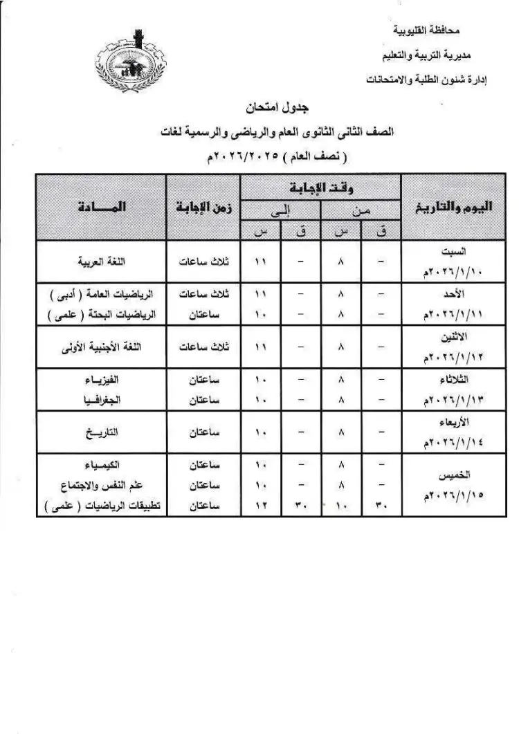 جدول امتحانات تانية ثانوي الترم الأول 2026 القليوبية