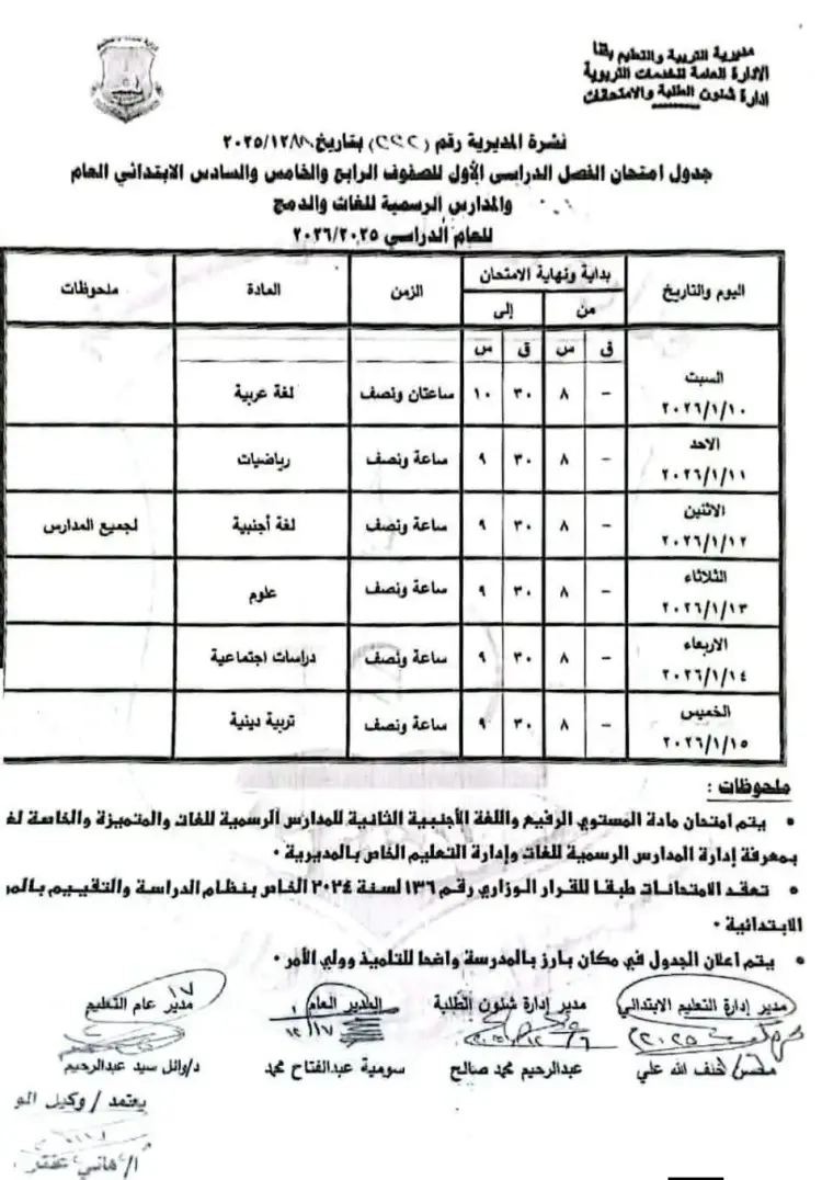 نتطرق في السطور التالية إلى جدول امتحانات الترم الأول الصف السادس الابتدائي 2026 قنا.