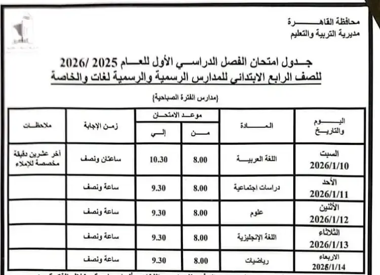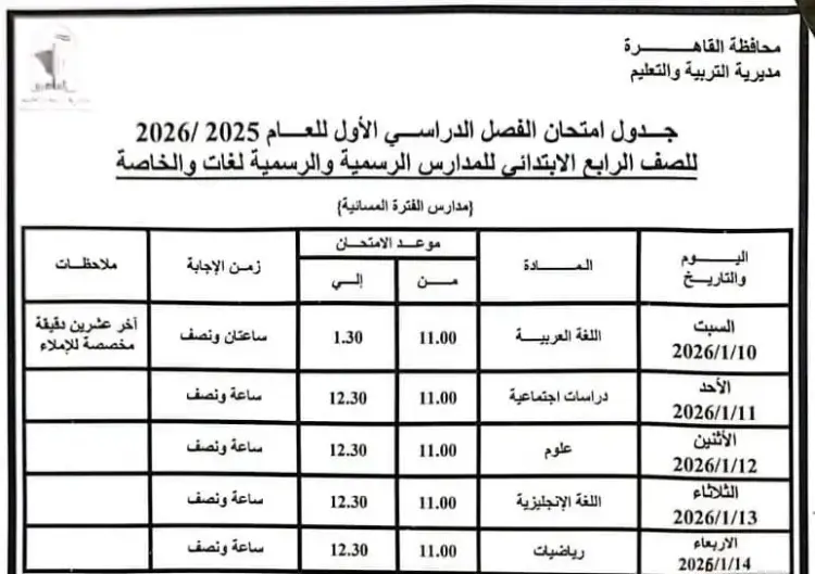 وجاء جدول رابعة ابتدائي الترم الأول محافظة القاهرة 2026 على النحو التالي: