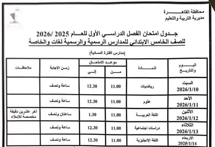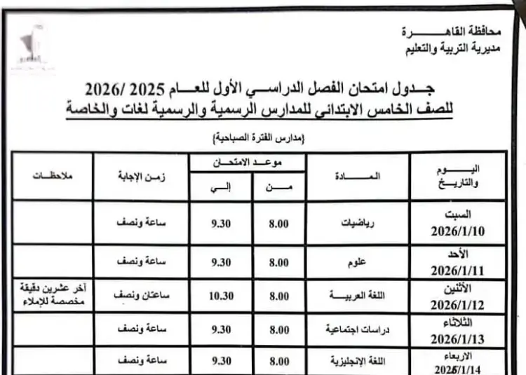 جاء جدول امتحانات الترم الأول خامسة ابتدائي محافظة القاهرة 2026 على النحو التالي:
