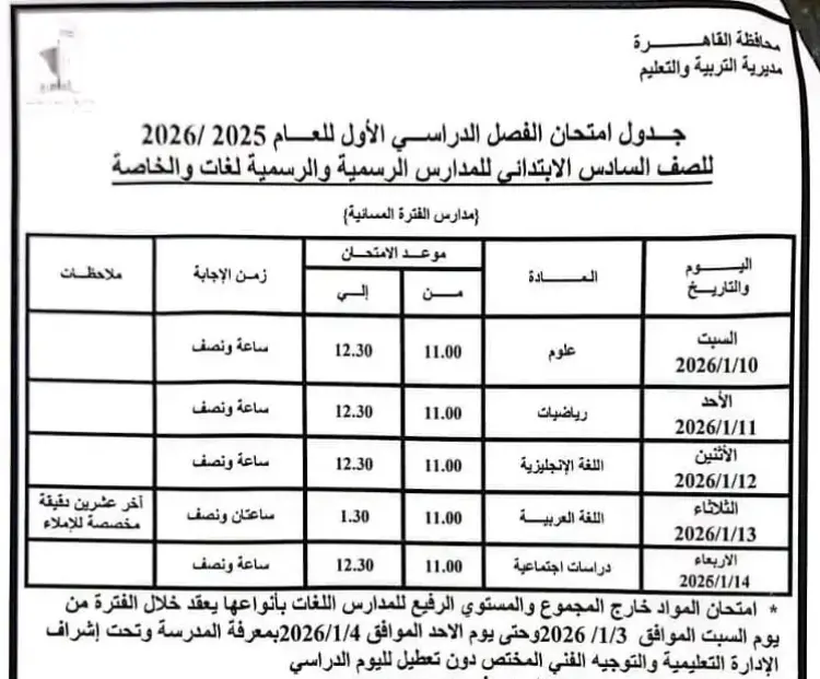 جاء جدول امتحانات الترم الأول الصف السادس محافظة القاهرة 2026 على النحو التالي: