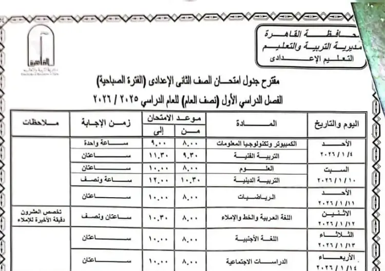 نتطرق في السطور التالية إلى جدول امتحانات الصف الثاني الإعدادي الترم الأول 2026 القاهرة.