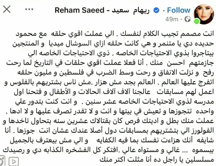 وكتبت ريهام سعيد في منشورها: «ولا كتبت حاجة و لا حذفت حاجة ولا هو شاف بوستات انتوا هاتألفوا؟ ولا هارد على ناس تافهة وإللي هايكتب حرف عن لساني مش موثق بدليل هايترفع عليه قضية.. كفاية فبركة بوستات أنا لما أرد على حد لازم إلي بيتكلم يكون ليه قيمة».