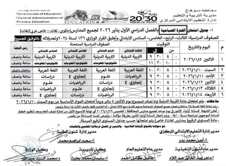 جدول امتحانات الصف الرابع الابتدائي محافظة سوهاج الترم الأول 2026
