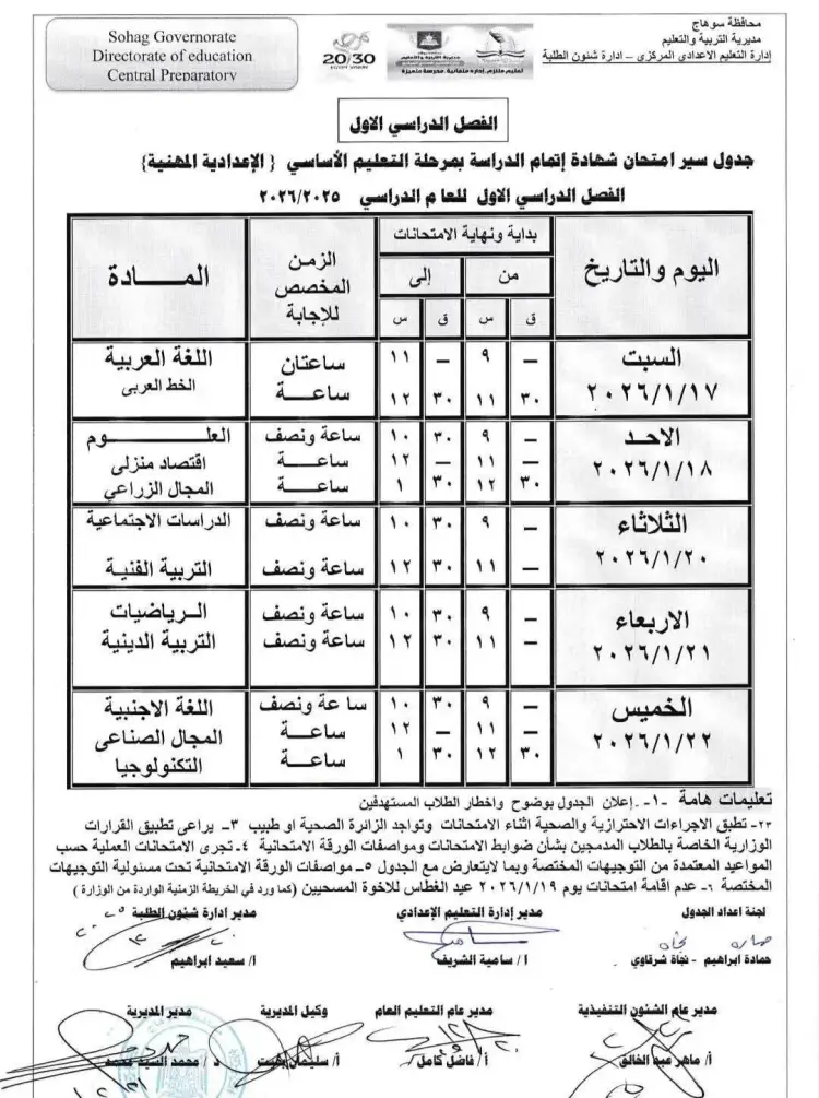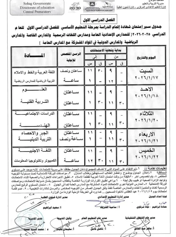 جدول امتحانات الشهادة الإعدادية ترم أول 2026 سوهاج