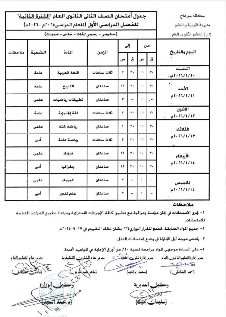 جدول امتحانات تانية ثانوي ترم أول 2026 سوهاج