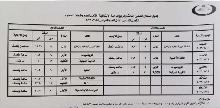 جدول امتحانات رابعة ابتدائي ترم أول 2026 بني سويف