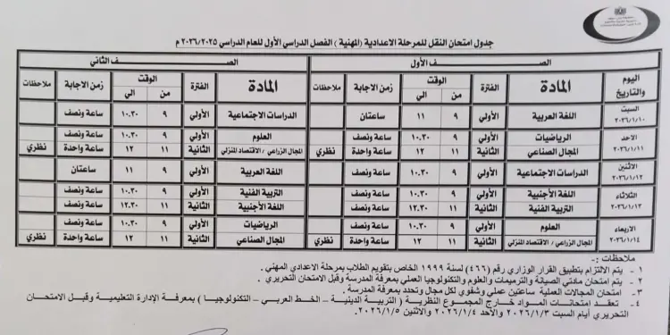 جدول امتحانات أولى إعدادي ترم أول 2026 بني سويف
