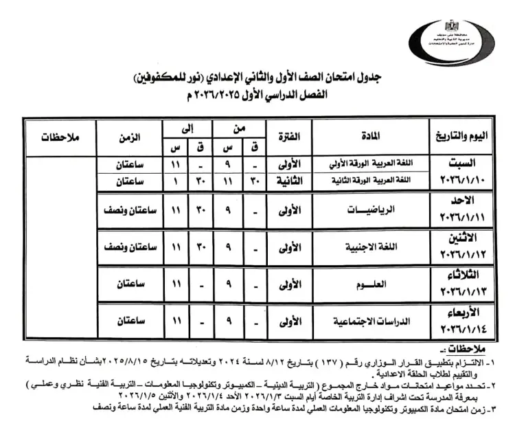 جدول امتحانات الصف الأول الإعدادي محافظة بني سويف الترم الأول 2026