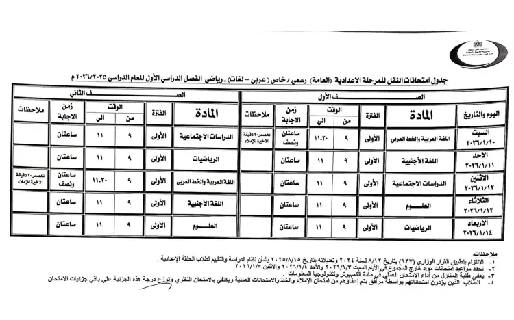 أعلنت مديرية التربية والتعليم ببني سويف عن جدول امتحانات النقل للمرحلة الإعدادية «العامة» للصف الأول الإعدادي بالفصل الدراسي الأول للعام 2025 2026.