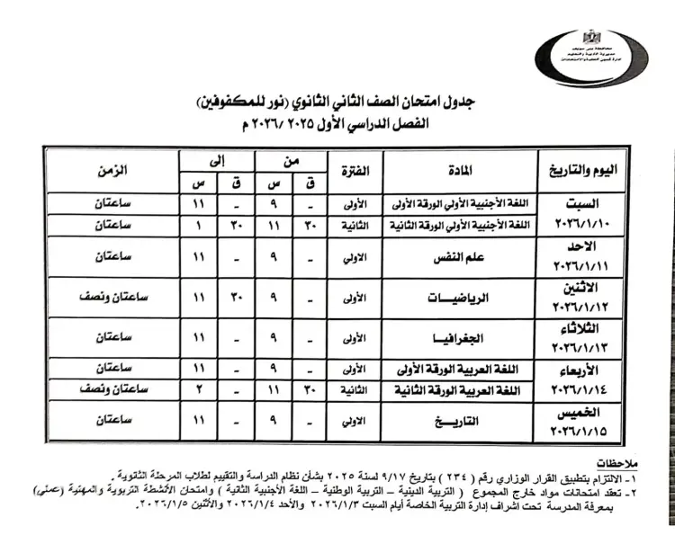 يوم الأربعاء 14 يناير 2026: مادة الجغرافيا / مادة الفيزياء (ساعتان من الساعة 9:00 إلى الساعة 11:00) - مادة تطبيقات الرياضيات لطلاب «القسم العلمي» (ساعتان من الساعة 11:30 إلى الساعة 1:30).