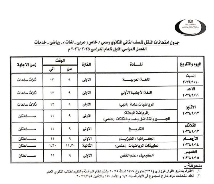 أقرت المديرية مجموعة من الملحوظات الهامة المرفقة بالجدول، حيث شددت على الالتزام بتطبيق القرار الوزاري رقم 234 بتاريخ 17 سبتمبر 2025 بشأن نظام الدراسة والتقييم لطلاب الثانوي العام.