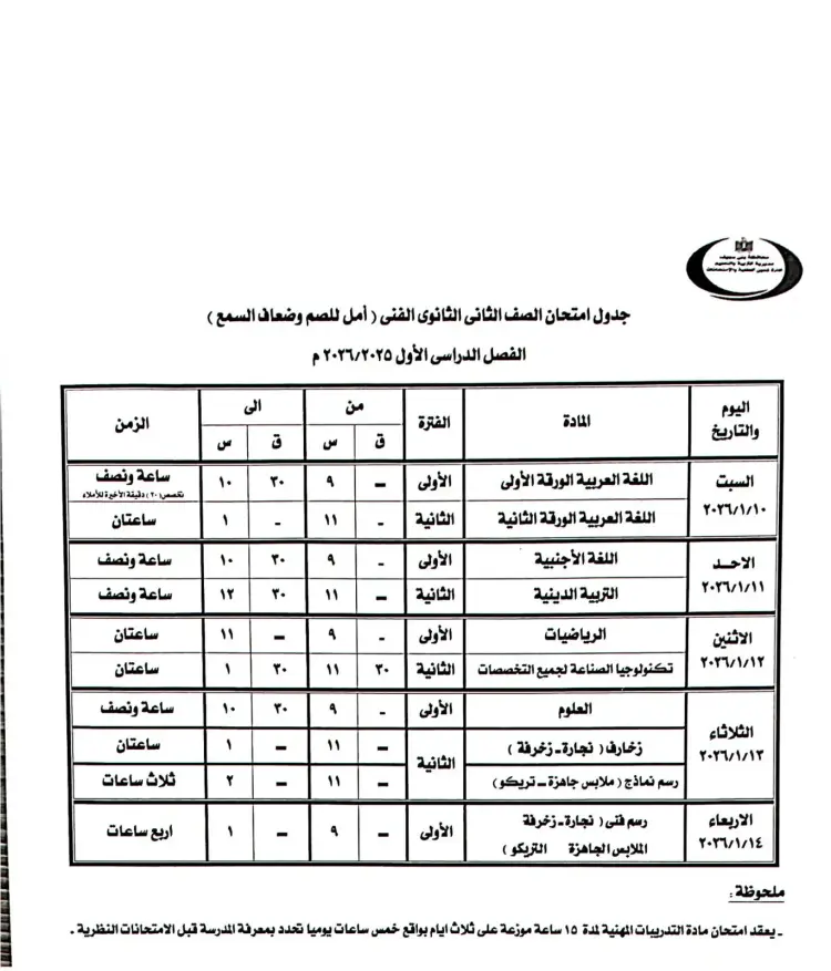 جدول امتحانات تانية ثانوي ترم أول 2026 بني سويف