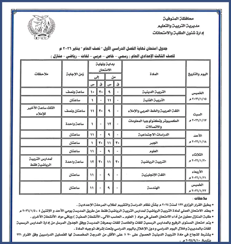 جدول امتحانات الصف الثالث الإعدادي محافظة المنوفية الترم الأول 2026
