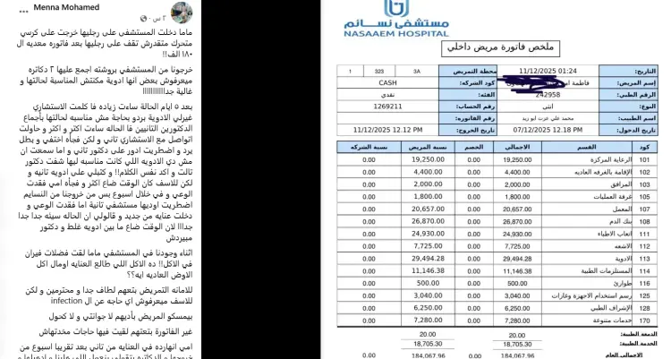وتكشف الوثيقة التي نشرتها عن فاتورة علاج باهظة تجاوزت قيمتها 184 ألف جنيه مصري مقابل رحلة علاجية انتهت بفقدان المريضة للوعي ودخولها العناية المركزة في منشأة طبية أخرى.