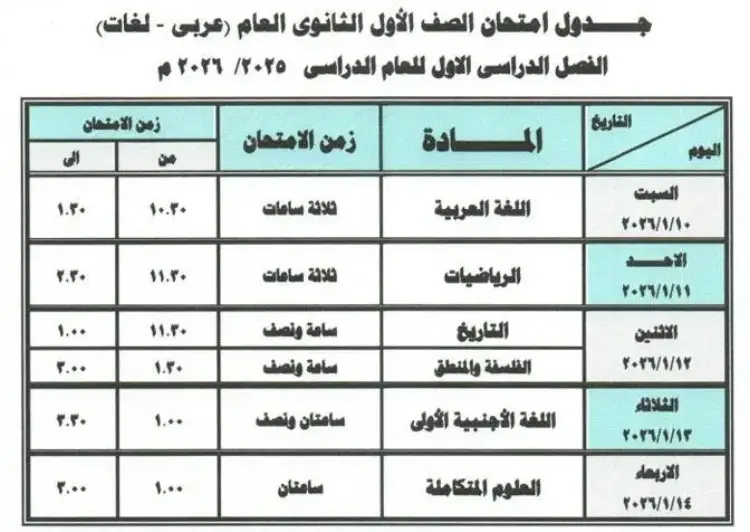 الاثنين 12 يناير 2026: التاريخ (ساعة ونصف من الساعة 11:30 إلى الساعة 1:00)، يليه امتحان الفلسفة والمنطق (ساعة ونصف من الساعة 1:30 إلى الساعة 3:00).