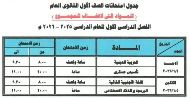 الأحد 4 يناير 2026: التربية الدينية (ساعة ونصف من الساعة 8:00 إلى الساعة 9:30)، يليه امتحان تأسيس عسكري (ساعة واحدة من الساعة 10:00 إلى الساعة 11:00).