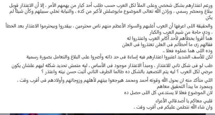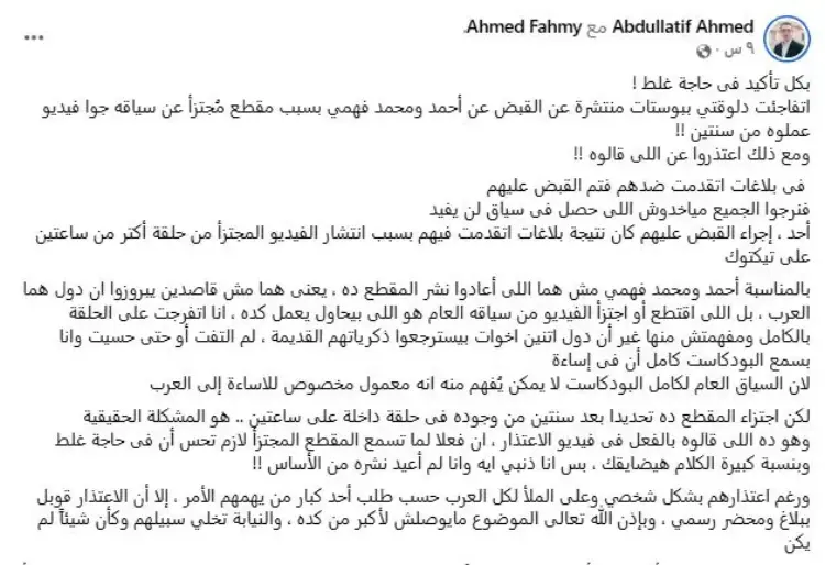 أقر صانع المحتوى أحمد فهمي بأن الفكرة طُرحت حينها بشكل خاطئ، موضحا في رسالة الاعتذار: «أكيد مكنش مقصود كل قبائل العرب في المحافظات المختلفة، ومكنش المفروض يتم التركيز على فئة سيئة وأحداث فردية».