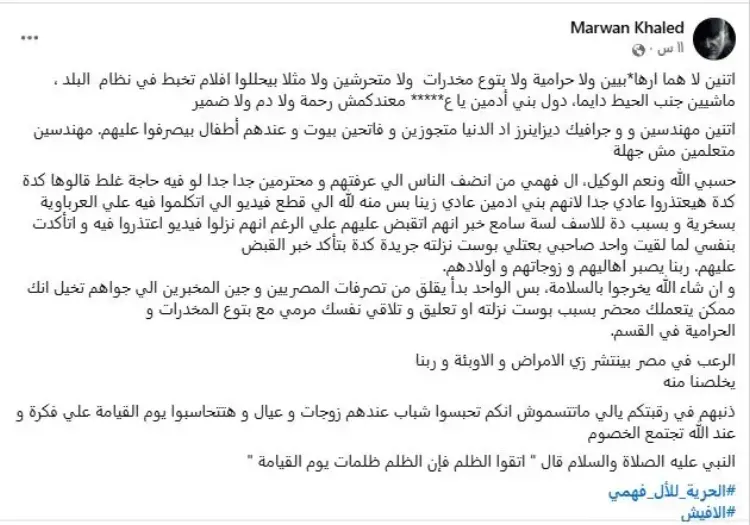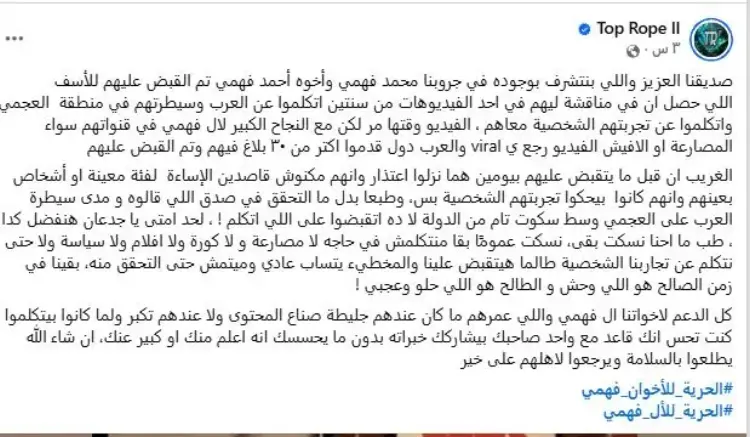 وذكر أحد المتضامنين في منشور له أن الشقيقين هما «مهندسان ومصممو جرافيك متعلمين وليسوا جهلة»، مؤكدا أنهم بادروا بالاعتذار فور شعورهم بأن كلامهم قد أُسيء فهمه أو تسبب في ضيق للبعض.