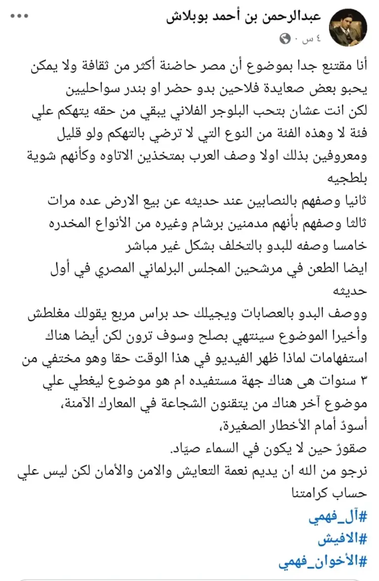 وجاءت هذه الخطوة عقب تداول واسع لمقطع فيديو اعتبره الكثيرون مسيئا للقبائل العربية في منطقة غرب الإسكندرية، مما أثار موجة من الغضب الشعبي والدعوات للمحاسبة القانونية.