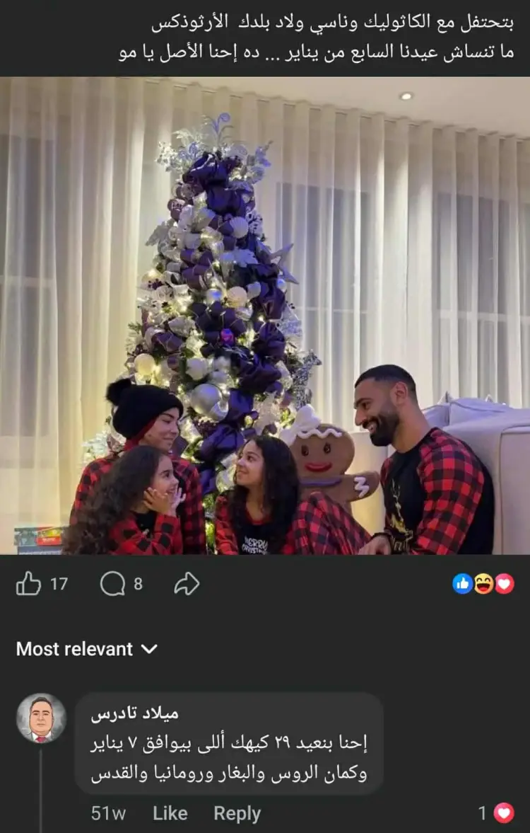 وأشار متابعون إلى أن الجدل لا يتعلق بالاحتفال ذاته، بقدر ما يرتبط بتكرار الموقف سنويا، حيث ينشر المحتوى نفسه تقريبًا في موعد يسبق عيد الميلاد الأرثوذكسي، ما يراه منتقدون «تجاهلا غير مقصود لكنه مستفز للبعض».