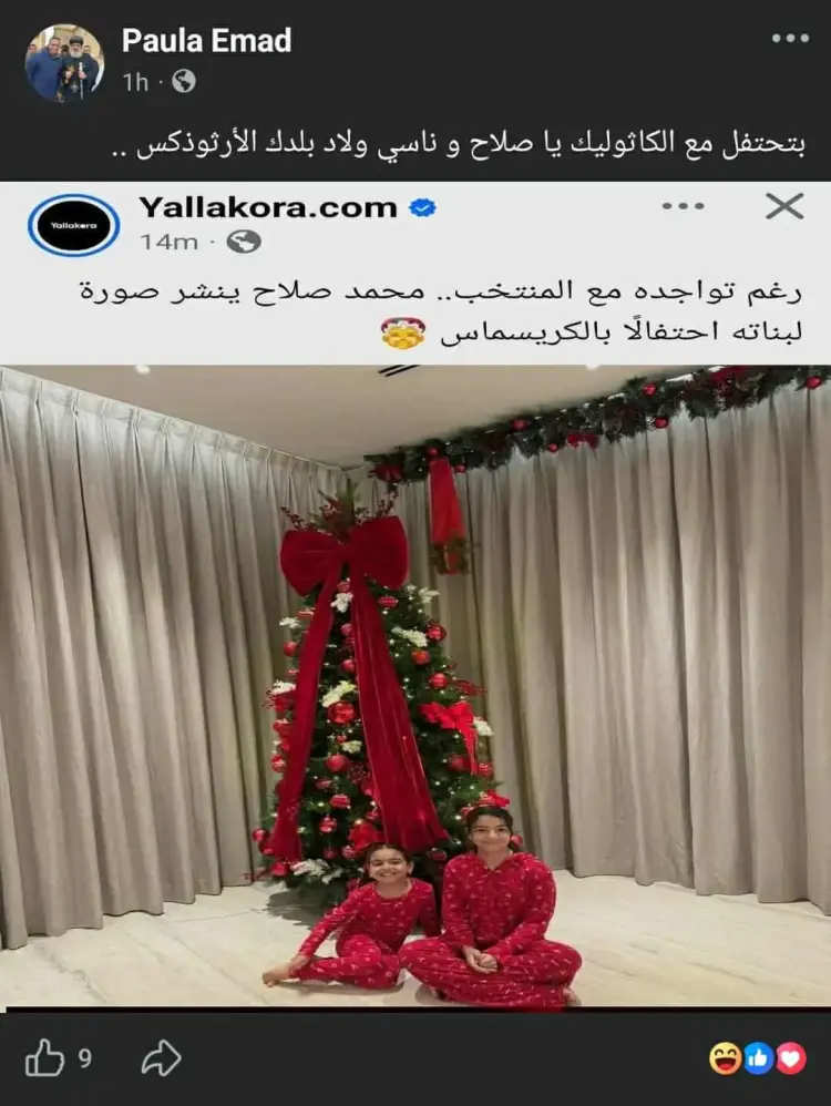 تداول مستخدمون صورا لأسرة اللاعب محمد صلاح، ظهر فيها داخل منزله إلى جوار شجرة كريسماس مزينة، فيما بدا أفراد أسرته مرتدين ملابس احتفالية، الأمر الذي فتح بابا واسعا للنقاش حول توقيت الاحتفال ودلالاته الثقافية.