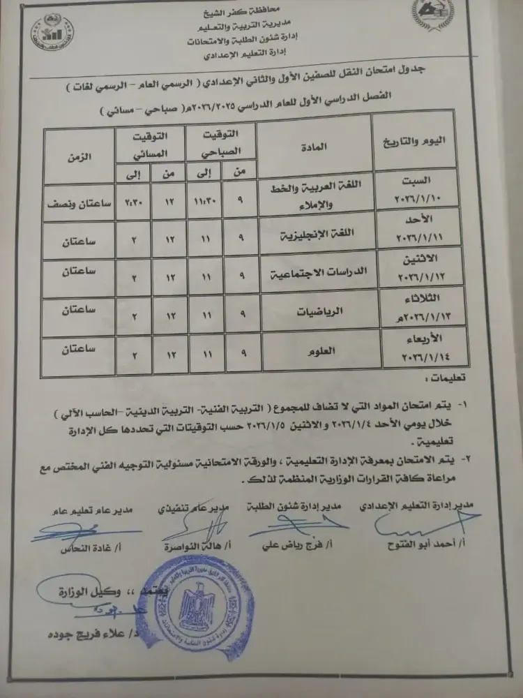 جاء جدول امتحانات الصف الثاني الإعدادي الترم الأول كفر الشيخ 2026 على النحو التالي: