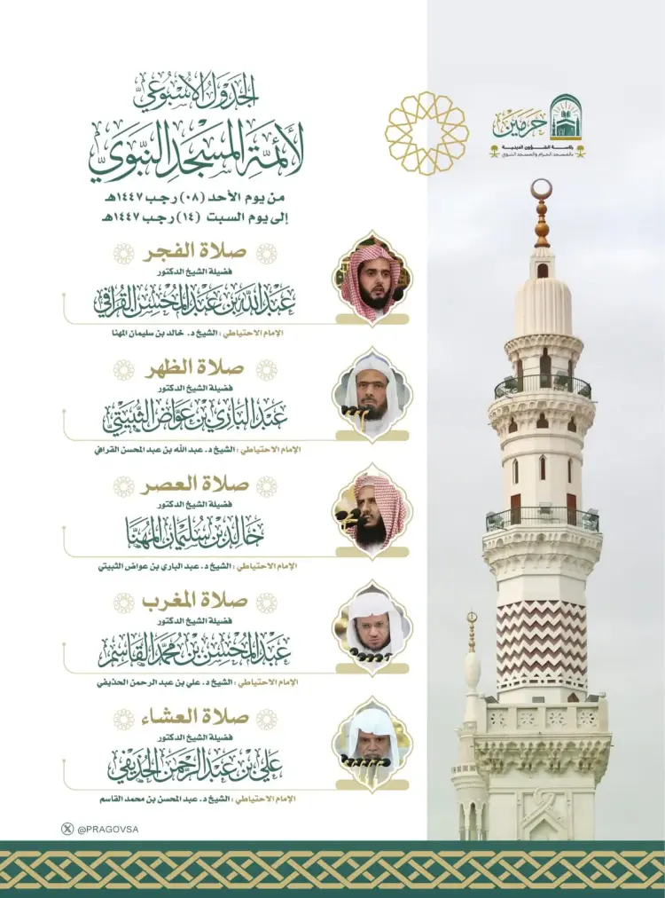 جدول أئمة المسجد النبوي هذا الأسبوع 1447