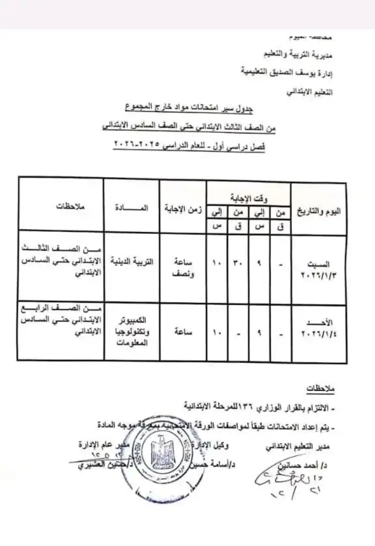جدول امتحانات رابعة ابتدائي ترم أول 2026 الفيوم