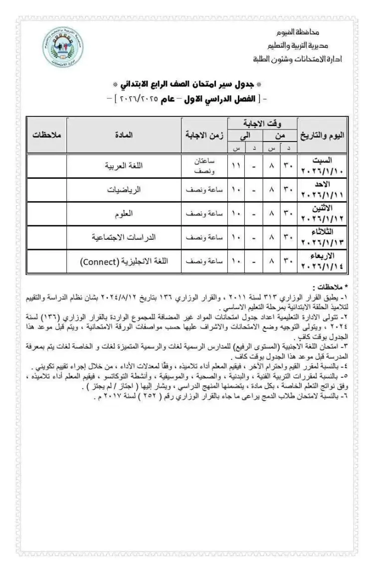 جدول امتحانات الصف الرابع الابتدائي محافظة الفيوم الترم الأول 2026