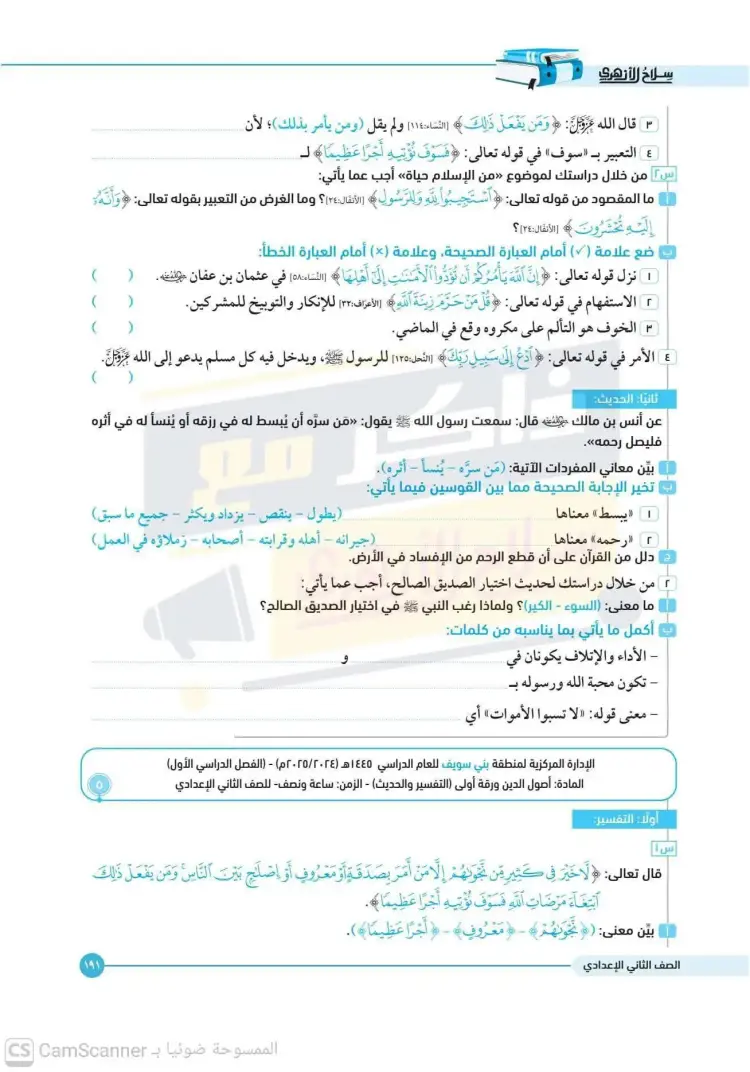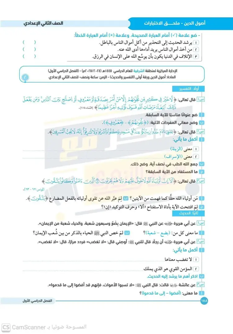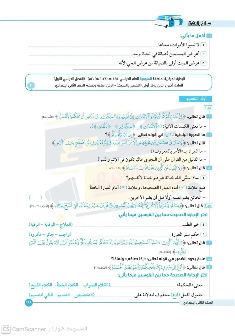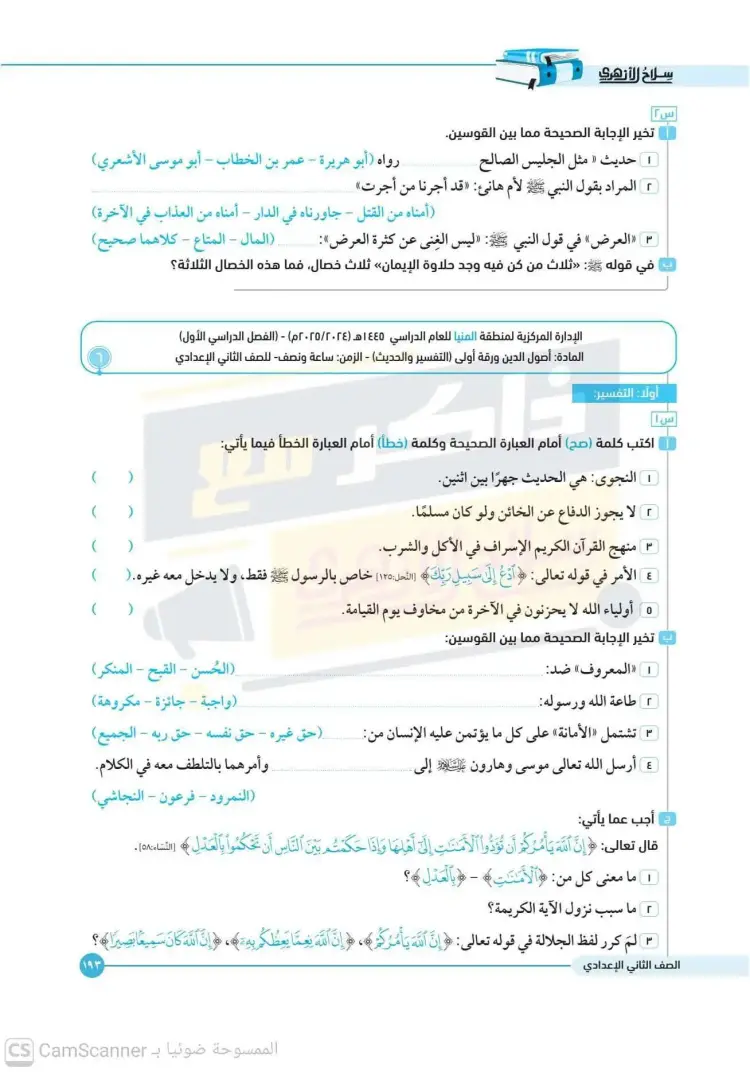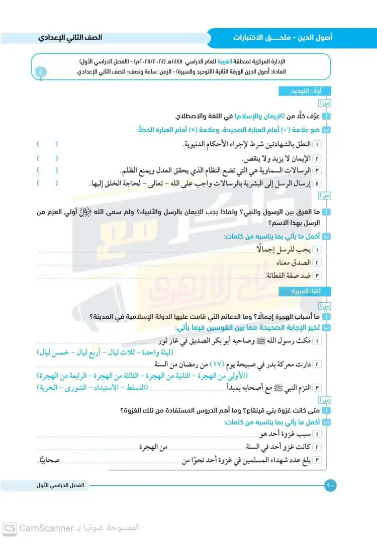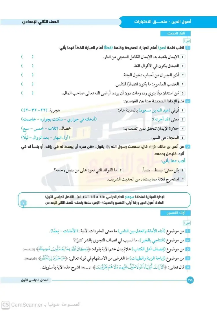 امتحانات أصول دين تانية إعدادي أزهر ترم أول 2025 2026