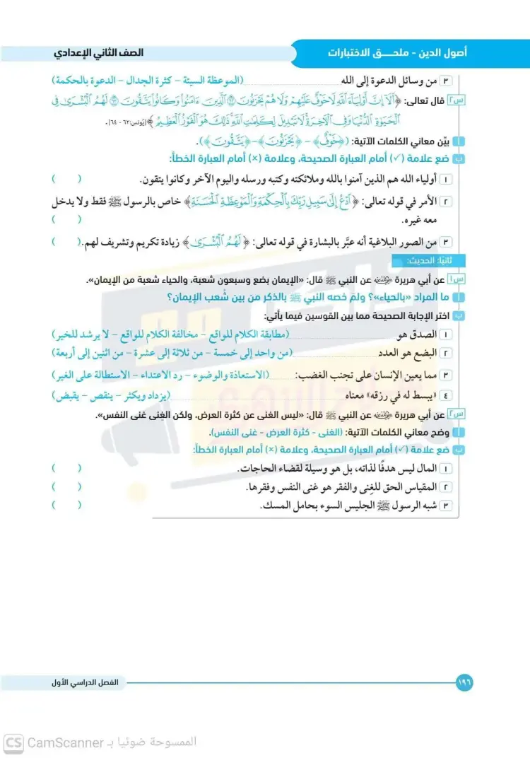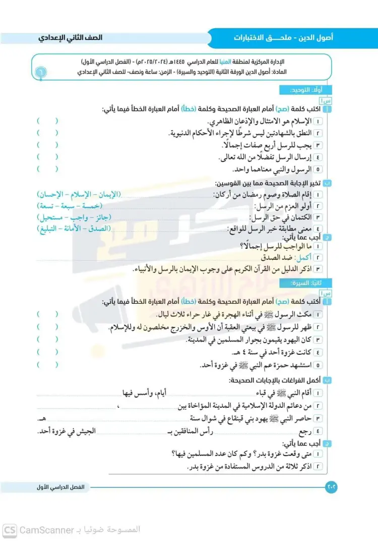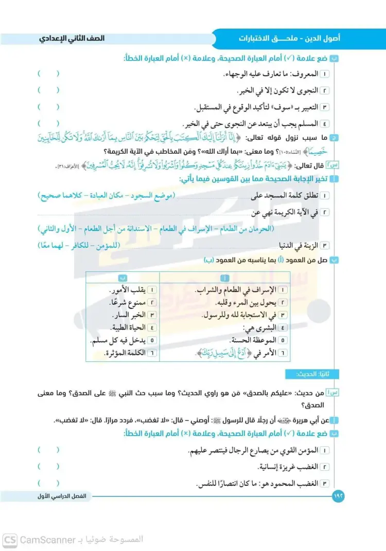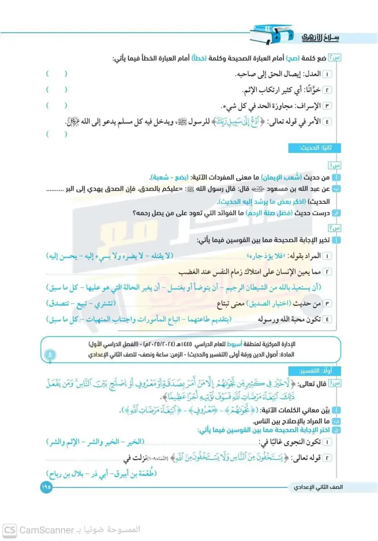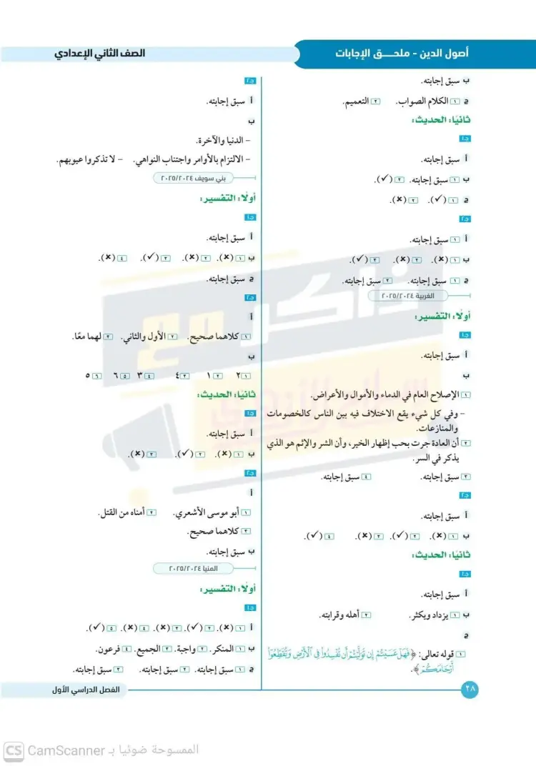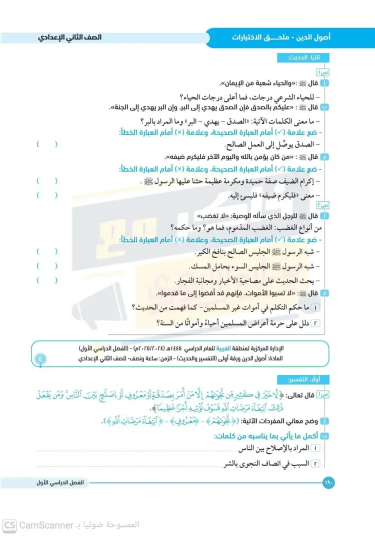 امتحانات أصول دين تانية إعدادي أزهر ترم أول 2025 2026